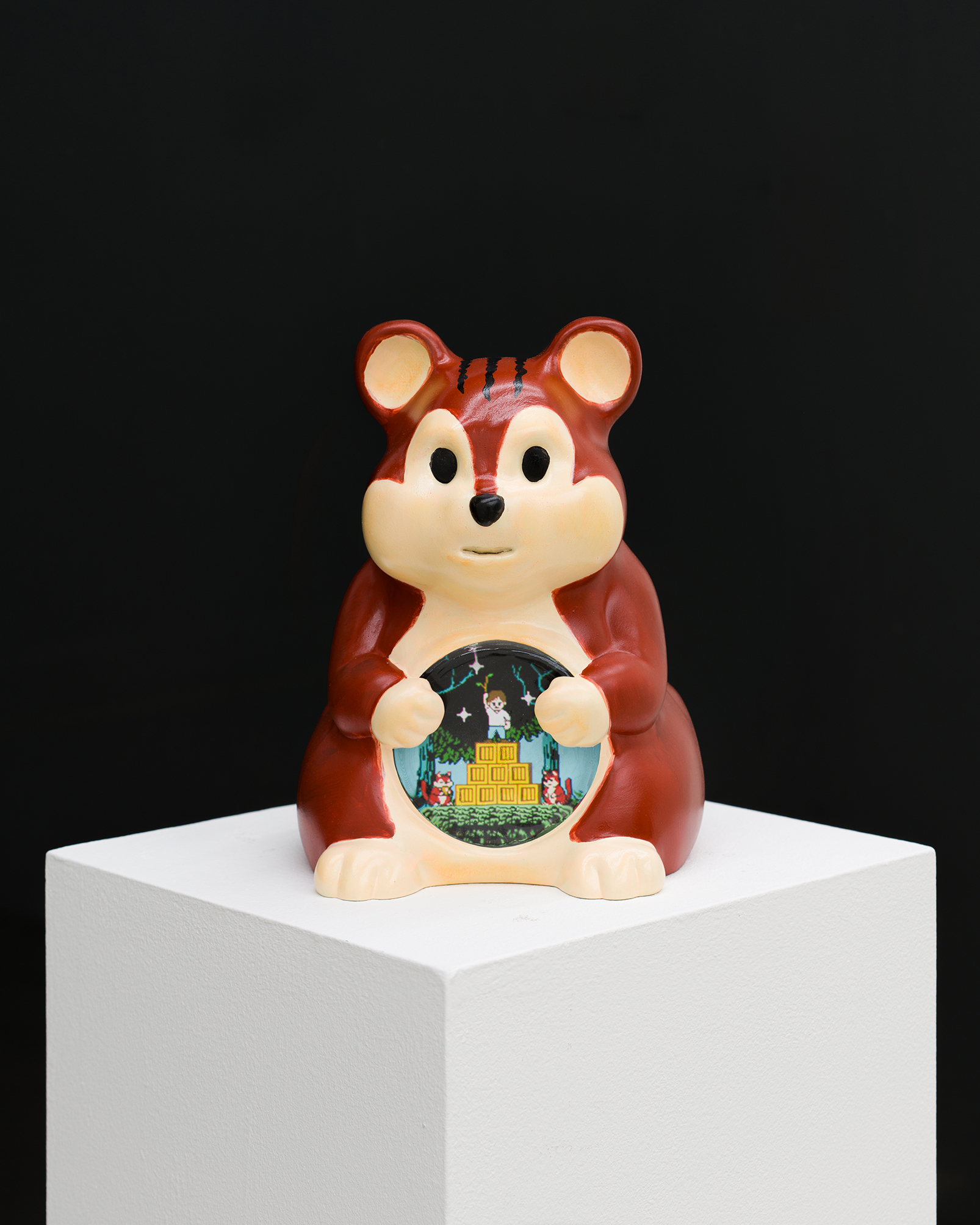 Hansaem Kim(b.1990) creates works that exist at the intersection of analog and digital, reality and imagination, life and death, luxury and kitsch. His art draws inspiration not only from the digital culture of his time but also from various subcultures such as comics, games, novels, classic films, and merchandise. He often intentionally combines two or more genres or formats, using the paradoxical energy generated from these clashes as a key element of his work. For instance, Kim produces images in the form of 2D interfaces and RPG video games within digital environments, blending them with physical materials like plastic, resin, and gold leaf to extend them into real time and space. His method of active remixing and grafting creates an imaginative space where existing narratives of reality can be twisted and reimagined.