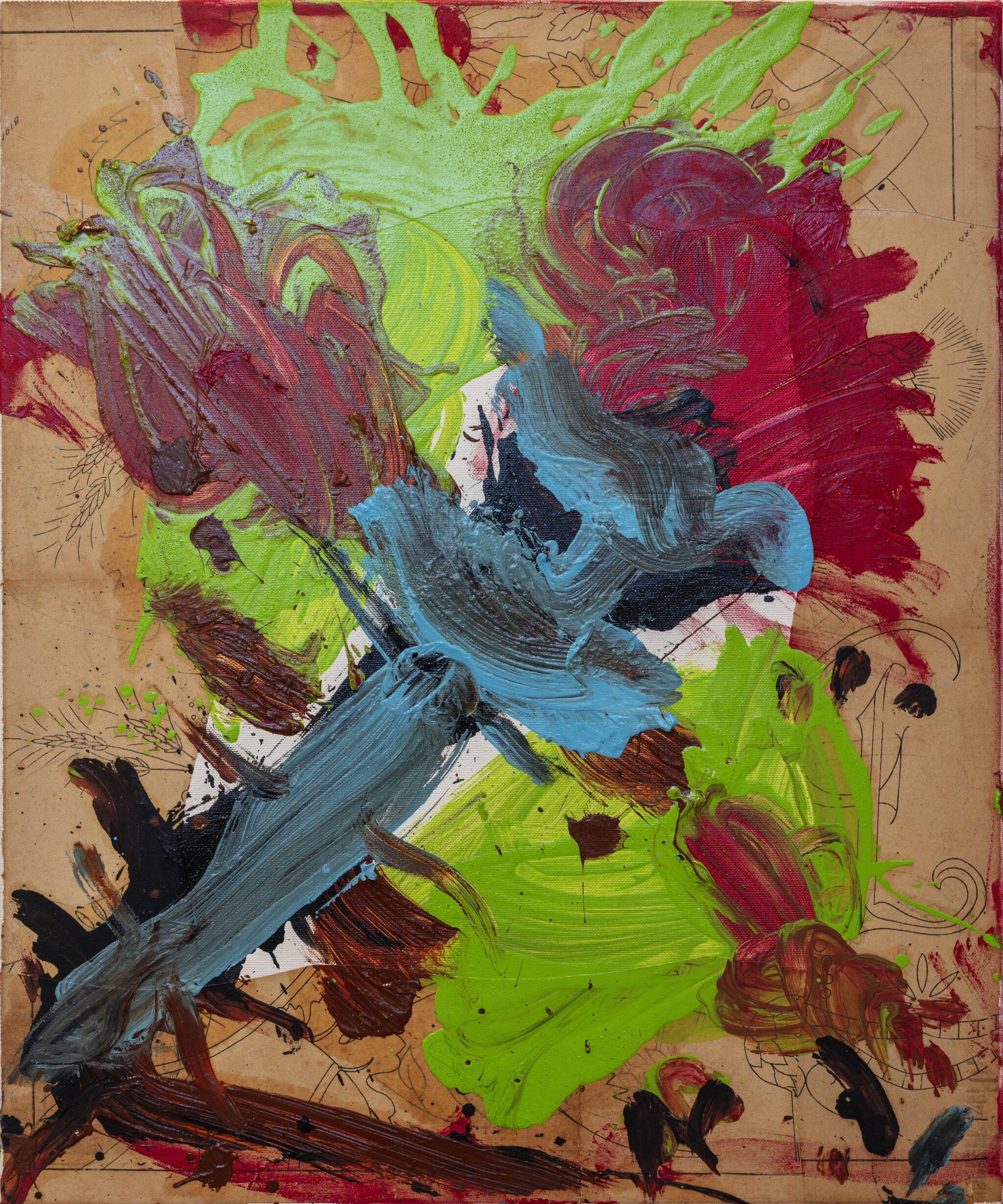 The lush, bravura paintings of Spanish artist Jorge Galindo move between gestural abstraction and figuration, incorporating elements of collage. The painter, who lives and works in Porto, Portugal, has described his expressionistic style as “dirty pop.” In Galindo’s hands, this idiom brings together various chapters of twentieth-century painting—the collage of synthetic cubism, the aggressive and immediate brushwork of Willem de Kooning, and the commodity critique and juxtaposition of Haim Steinbach—as well as the Renaissance genre of still life. In the early 1990s, Galindo studied with Julian Schnabel in the Círculo de Bellas Artes workshops in Madrid; there, he made paintings inspired by Dadaists, especially Hannah Höch, as well as paintings that integrated photomontages of images sourced from midcentury printed materials. In 1996, he introduced swaths of colored and patterned fabrics into his abstractions with his Patchwork paintings; and his first figurative series, Pintura animal (1999), features kitsch-like renderings of hybrid canine creatures bathed in dramatic splatters and drips of paint.
