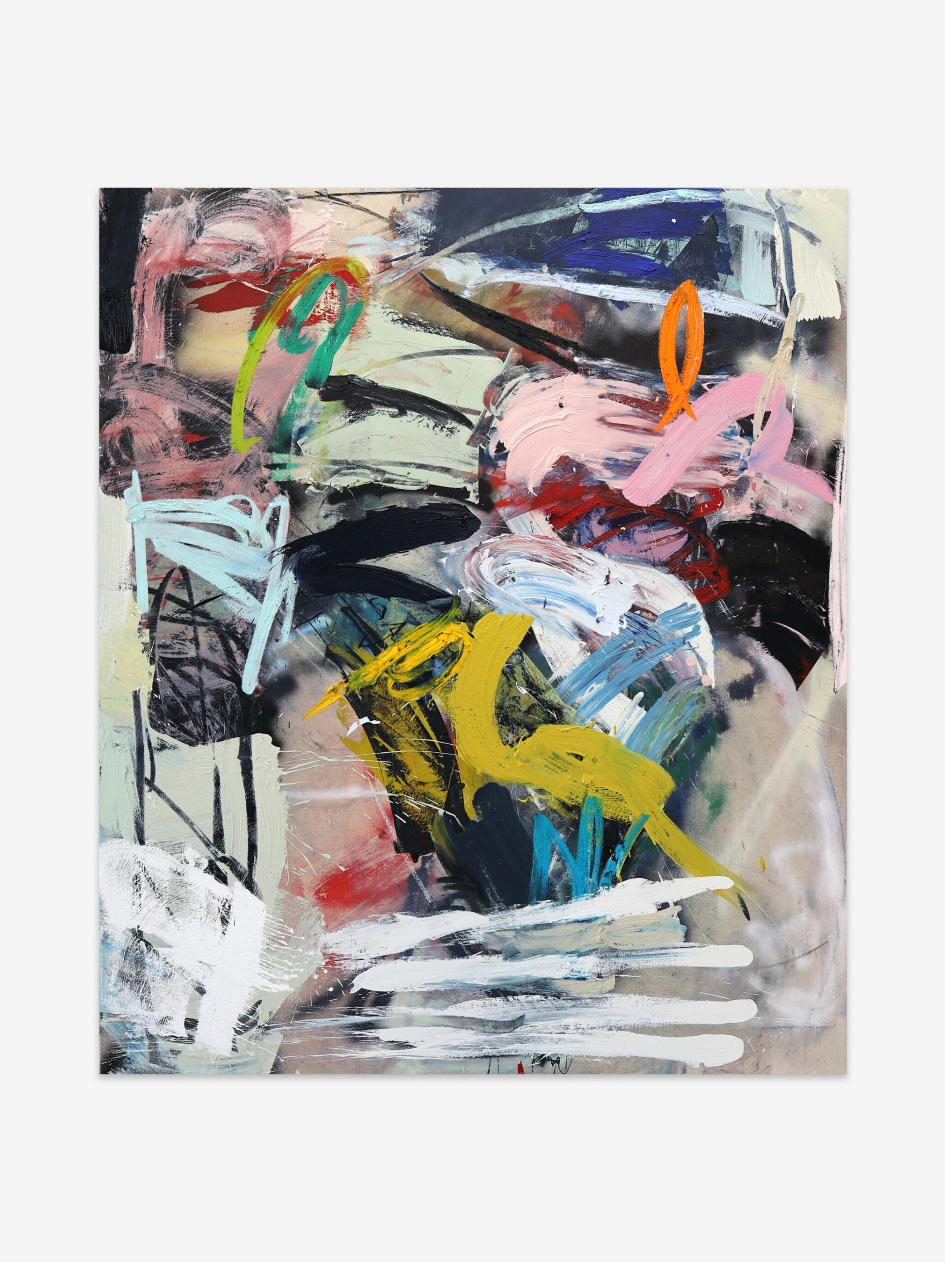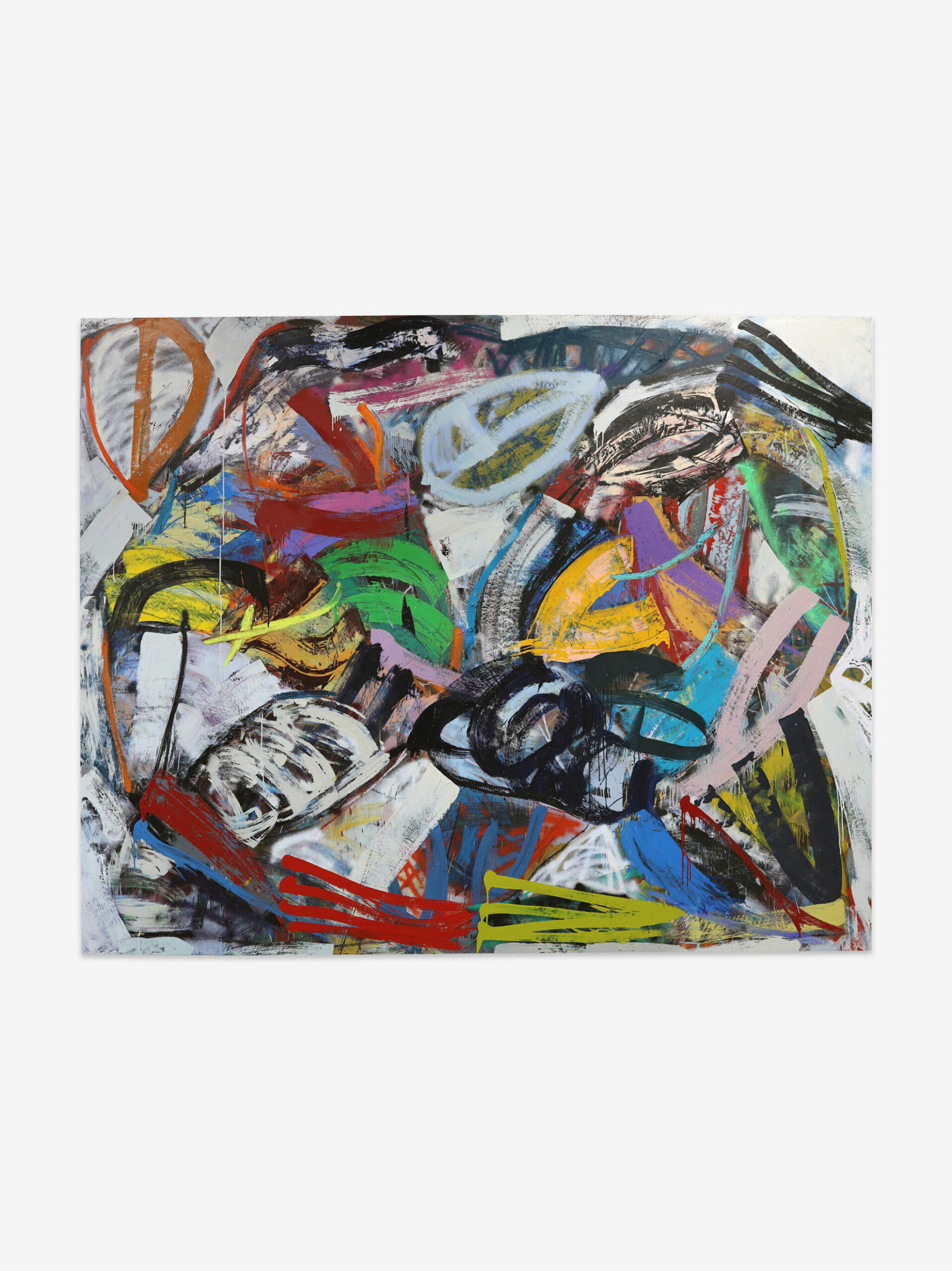 Baxter’s approach to painting begins by mark marking which evolves into line drawings of human forms and body parts, squeezed into the rectangular space of the canvas. These figures swiftly mutate into channels for an obsessive exploration of paint potentials. He encompasses all the intensities, materials, and mediums – the thickest and the thinnest lines, smashing strokes and gentle touches, spray paints, pigment sticks and chalks, scrapers, pallet knives, various sized brushes, along with hand smeared marks. The initial actions are continuously reworked until they exist merely as dynamic gestural postures. Many of these figurative poses are inspired by the old masters – Delacroix, Rubens, Titian. When observed closely, they fade away, merging into the bold colors. In a reversal of the conventional layering of a composition, Baxter’s figures precede and even dictate the environment that they come to inhabit.