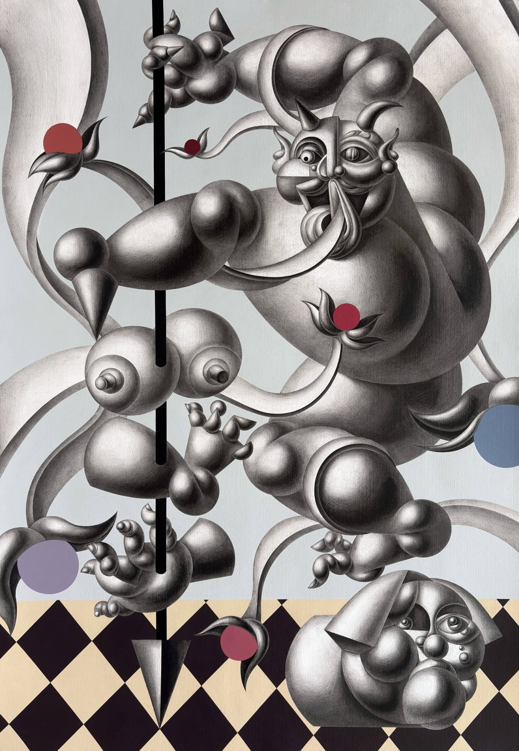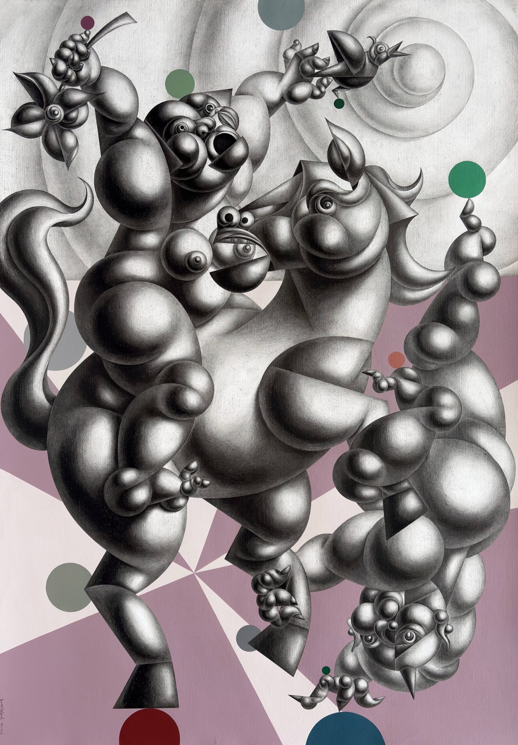 윤미선에게 신체는 고정된 오브제가 아니다. 오히려 그것을 가로지르는 정동이나 감정, 내적 긴장에 의해 조그맣게 수축되거나 역동적인 카니발의 한 장면으로 펼쳐지는 신축성 있는 구성물이다. 반복해 등장하는 원형의 기하학적 모티프는 모듈처럼 조립되기보다 일종의 표정 변화처럼 예측할 수 없는 방식으로 덩어리지어지고 또 분절되면서 복잡하게 얽힌 선과 면의 관계를 산출한다. 그렇게 얻어진 결과물은 인간의 형상을 닮았지만 서사의 중심으로 나타나지 않고 내부와 외부의 힘이 서로 당기고 버티는 장으로 제시된다. 10B 연필로 구현한 밀도 높은 그림자는 작가의 평면 작업에 독특한 3차원성을 부여하는데, 이는 캔버스 위에 섬유 조각을 덧대며 본래 평면적이지 않은 것을 평면적인 것으로 환원하고자 했던 초기 작업에 대한 방향 전환을 암시한다.