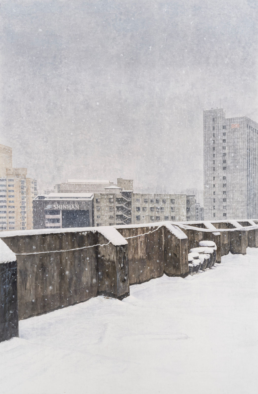 충정아파트를 다룬 일련의 회화는 이러한 문제의식을 밀도 높게 드러낸다. 1932년에 건립된 이 건물은 수차례의 증축과 구조 변경, 그리고 생활의 흔적이 중첩되며 원래의 건축적 질서를 명확히 식별하기 어려운 상태에 이르러 있다. 작가는 이 장소를 근대 건축의 표본이나 단순한 향수의 대상으로 다루기보다, 표면 위에 축적된 물질적 시간의 징후들을 집요하게 관찰한다. 이때 낡음과 부식, 덧대어진 흔적들은 건축의 외부에 놓인 요소라기보다 건물의 현재를 구성하는 층위로 드러난다. 복도와 계단, 난간과 창문, 굴뚝과 옥상과 같은 공간의 세부들은 서로 다른 시점에서 포착된 장면으로 화면 속에 축적되며, 하나의 장소가 시간 속에서 어떻게 변화해왔는지를 모자이크처럼 드러낸다. 이러한 관찰은 단순히 철거를 앞둔 건물을 기록하는 데 머물지 않고, 급격한 산업화와 도시화 속에서 형성된 도시의 기억과 그 안에 축적된 인간의 흔적을 시각적으로 아카이빙하는 과정으로 이어진다.