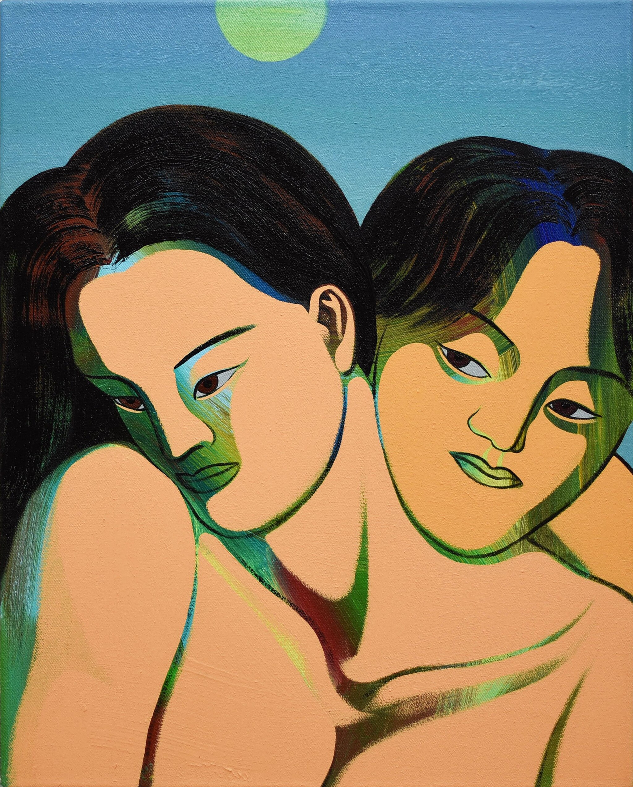 In this sense, Kim’s working method is a deliberate practice of weaving together iconography, allegory, color, and techniques rooted in both Western and Eastern art histories, reflecting an attitude that perceives reality through “multiplicity” itself. Through bright, primary-colored, intermediary nude bodies, Kim strips away the socio-cultural layers that encase an individual—culture, race, gender—and probes the essence of being human. This inquiry is inseparable from her own lived experience: born and raised between Korea and the United States, later settling as an artist in Vienna, she has navigated unfamiliar environments, encountering disorientation, and discovering and accepting her identity within this heterogeneous diversity.
