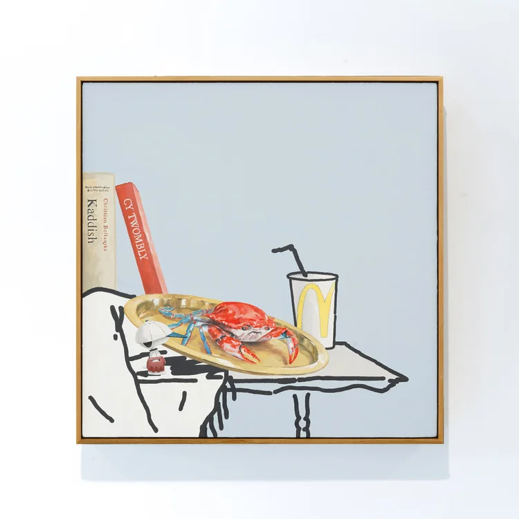 Wataru Ozu, Still Life with Books and Crab, 2025, Oil on canvas, 65.2 x 65.2cm. Courtesy of the Artist and AISHO.