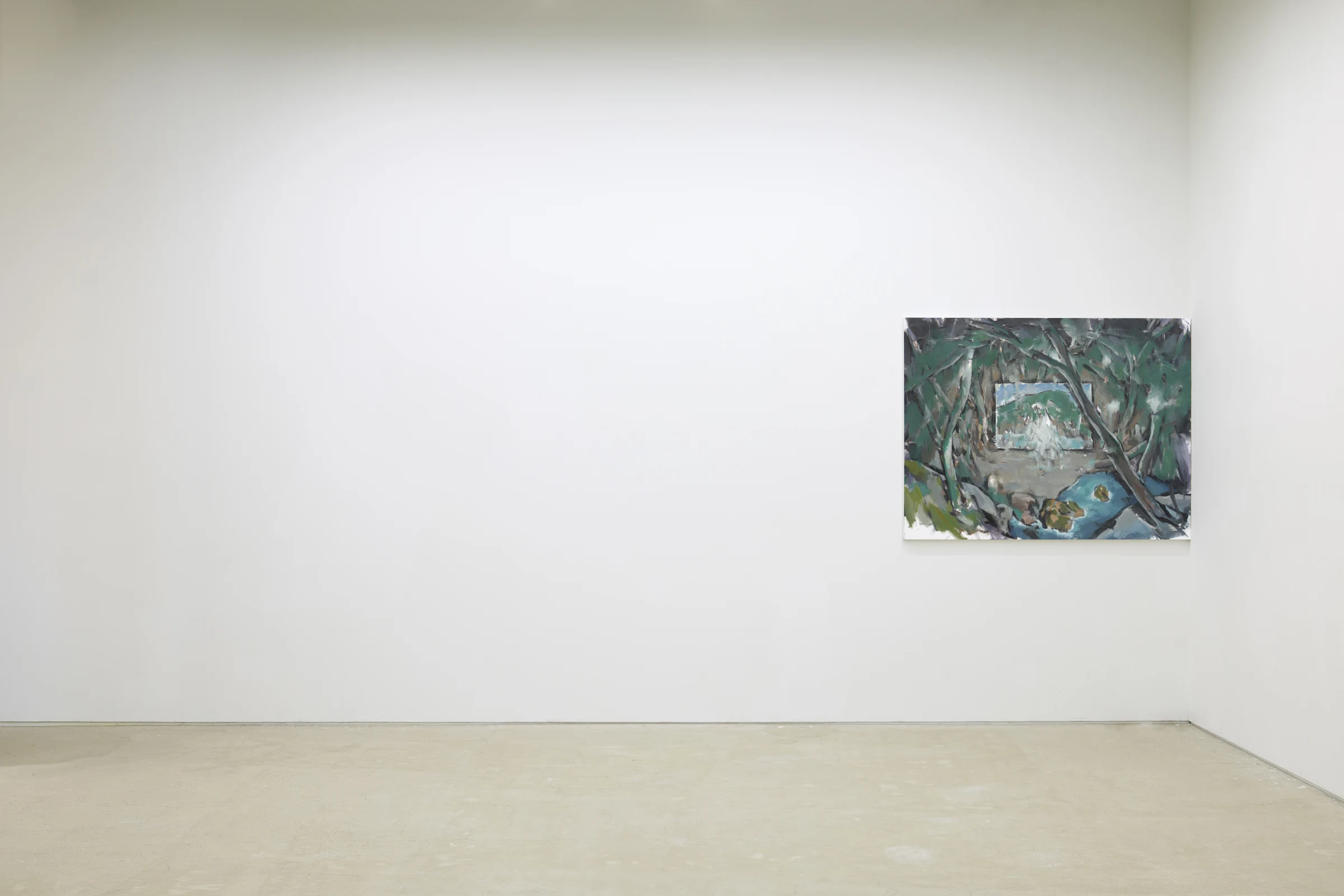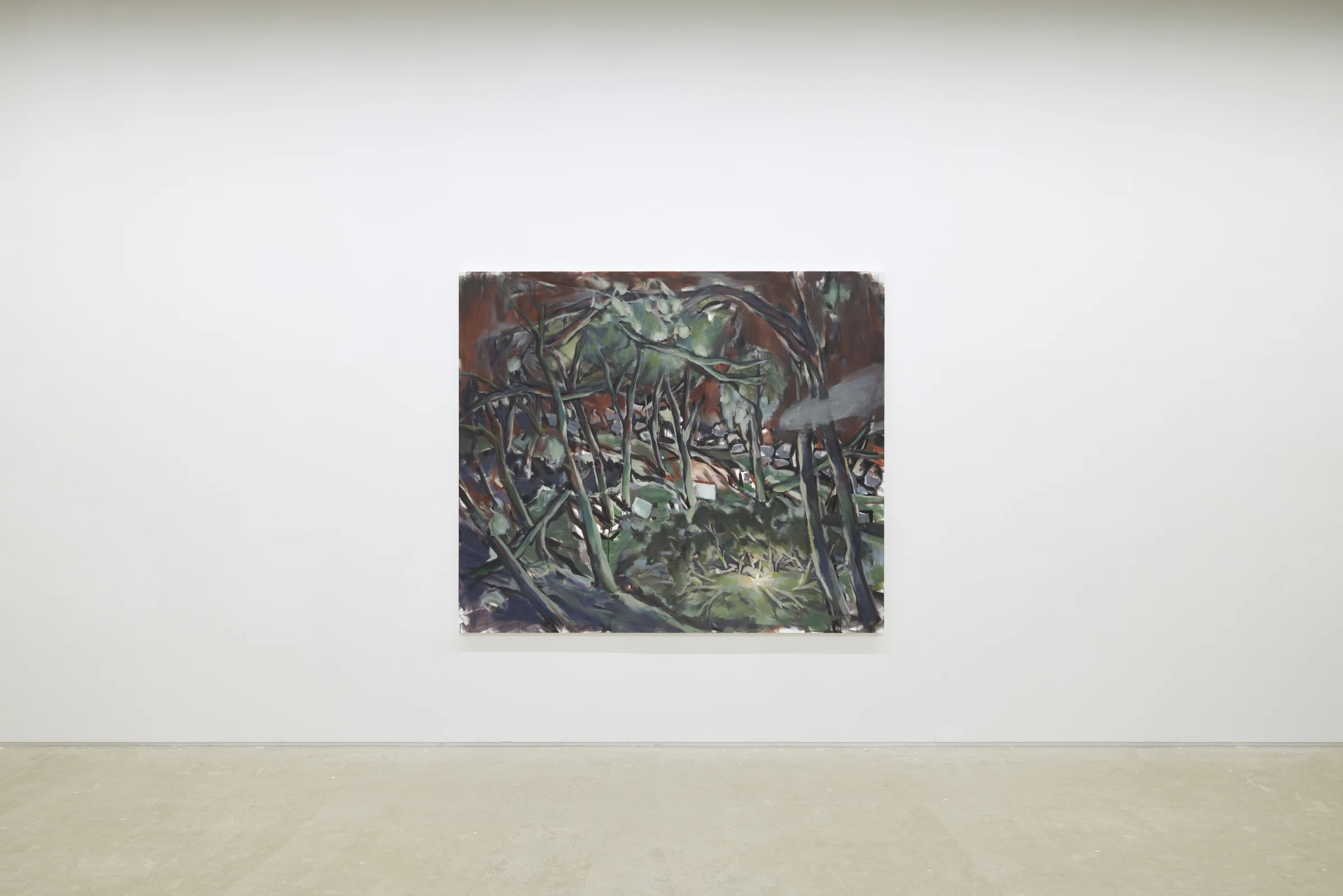 This turn comes from the overlapping of viewpoints and the structural unfolding of the canvas. For days, Jang fixes his gaze upon a singular place, translating the embodied knowledge of landscape to the canvas, an act fundamentally different from mere transcription. Memories of the directly observed flood forth all at once, while simultaneously, surrounding temporality and location collide with imagined imagery splintered from their original contexts. These layered, colliding registers compress into what Jang calls a hypothetical stage—a constructed arena wherein the impossible unfolds with the weight of lived encounter. Upon this stage, exaggerated and reduced elements coexist; different viewpoints converge on a single plane. Within this stage, ground flips to foreground; vertical and horizontal axes cross and dissolve. These compositions present reality’s logic askew—less a distortion than a process where nature’s order collapses and reconstitutes itself. Here, through the mediation of these tangled, intermixed elements, painting creates a space for its own structural foundations to be reimagined.
