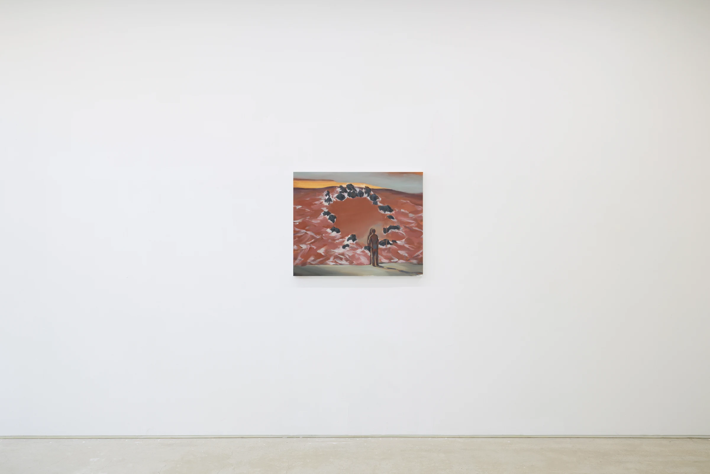 Island Painting (2025) is a large-scale polyptych of six connected canvases, capturing the progressive expansion of vision from sea to path, trees, mountains, and sky. This organic landscape where cerulean ocean occupies the upper register and verdant forest the lower conjures a surreal scene that can never be directly experienced. Yet this is neither purely aerial nor purely submerged; rather, these perspectives coexist and collapse into one another. The artist’s dual intention to receive this landscape, dismantle it, and reassemble it becomes visually palpable. This interrogation grows more radical in other works. In Flame and Pond (2025), Crimson Hill (2025), and Waterfall (2025), Jang physically interrogates the directional scaffold of the picture plane itself. The forest and water forms rendered across canvases rotated through multiple orientations no longer submit to the logic of up-down and left-right. Instead, they tangle together, while figures and fauna within stand as though stripped of all orientation. Rather than chaos, this constitutes a disciplined deconstruction, an ordered disorientation, a structural pivot wherein painting’s deictic center shifts from fixed composition toward the kinetic unfolding of the canvas itself, thereby inverting its structured ground.