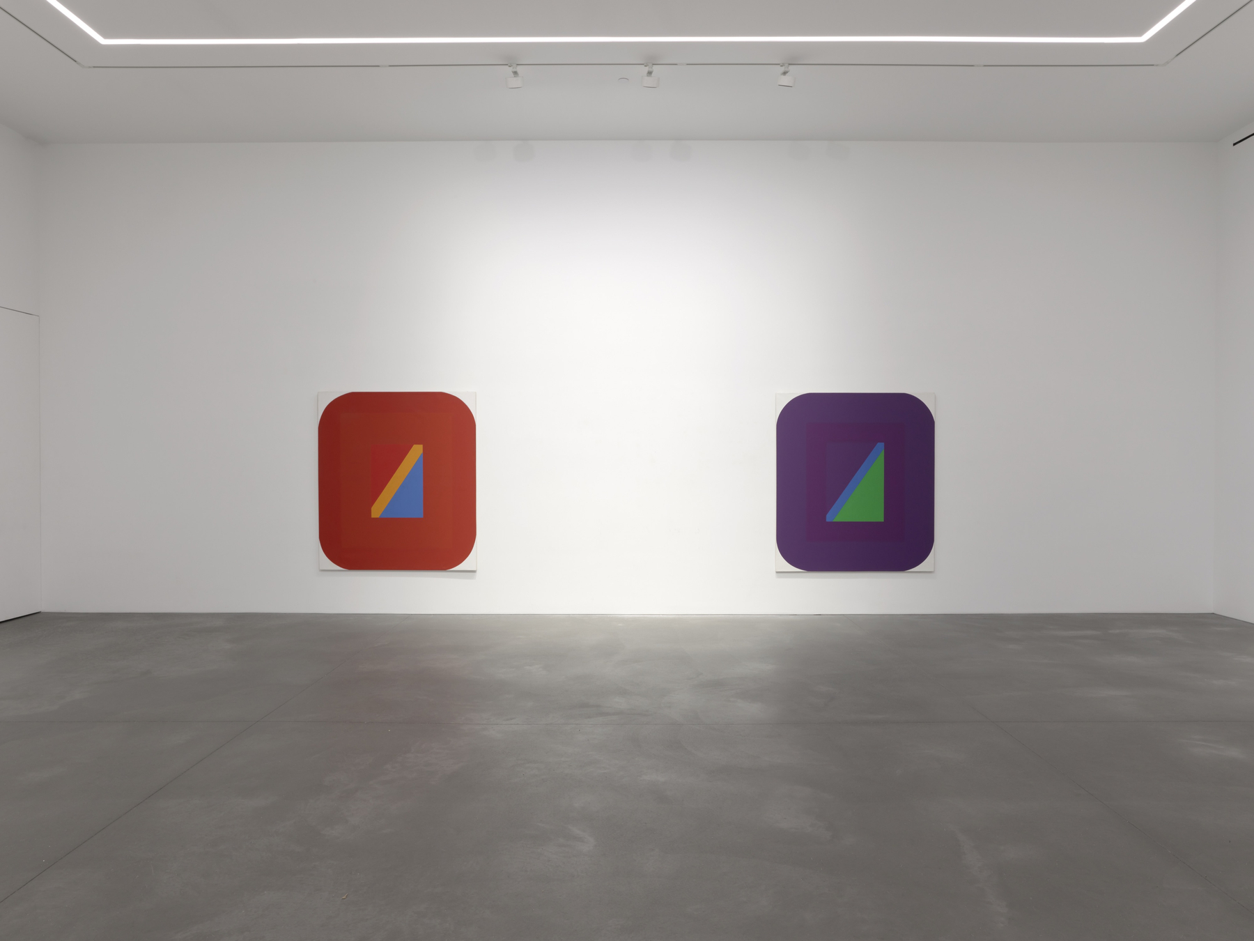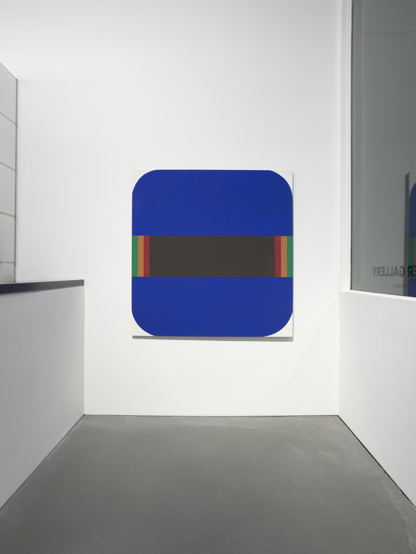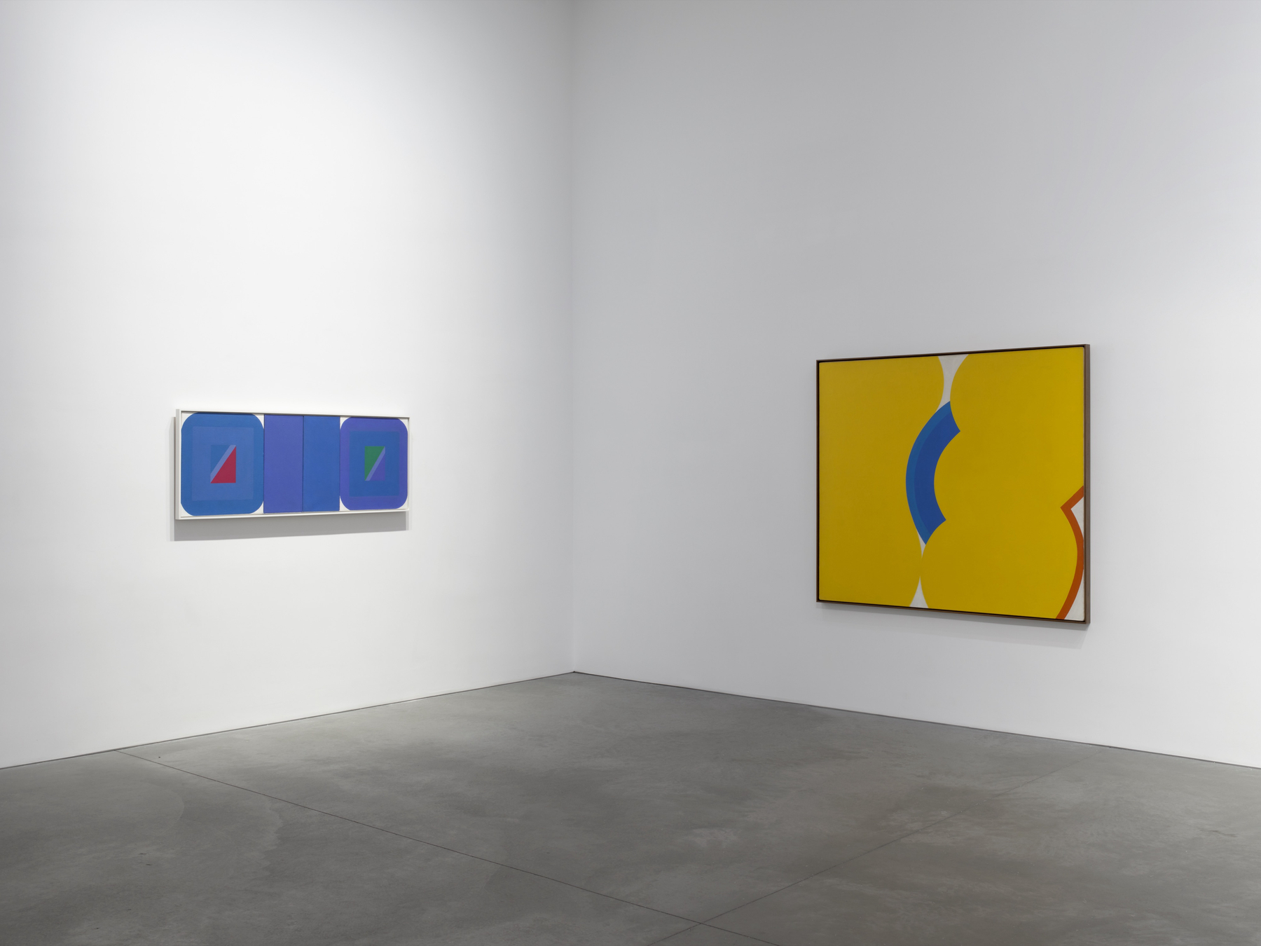 The exhibition features key works from two defining series. The Tex Series, developed over twelve years from the early 1960s, is noted for its rounded forms, which convey emotional resonance. Inspired by the tragedy of John F. Kennedy’s assassination, these softened shapes balance vibrant hues and angular forms, offering a reflective perspective on historical uncertainty. The Metro Series builds on these rounded forms, leaving canvas edges untouched to draw focus to dynamic central compositions. These works evoke an architectural quality, using color as a structural element to explore line and space on a grand scale.