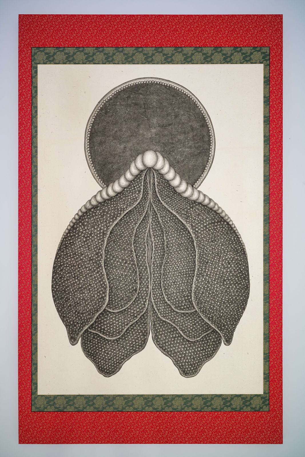 Artist Park Wunggyu’s creations function like a scalpel, dissecting the iconographic logic of classical Buddhist paintings from Korea and Japan through meticulous line work and pigment rendering. He introduces a critical perspective that projects a negative image of religious systems. In his reinterpretation of the Zen painting series “Ten Ox-Herding Pictures,” he presents close-up portraits of bovine entrails, where the physical processes of feeding, digestion, and excretion correspond to the tensions between the sacred and the profane, as well as the pure and the impure, within Zen spiritual practice—permeating the body’s porous cavities and crevices. In his vertical scroll series, Wunggyu retains compositional elements such as the halo of the Buddha and symmetrical designs while employing geometric and color distortions to deconstruct Buddhist imagery. He outlines contours that evoke the erasure of concrete divine figures. This approach dissolves the confrontational paradigm of religious solemnity, extending the realm of visual guidance toward a cosmic abstract divinity. Through these transformations, Park seeks to transcend rigidly defined doctrines, aiming to create chaotic ambiguities that cross boundaries—becoming either more authentic flesh or permeable shells.