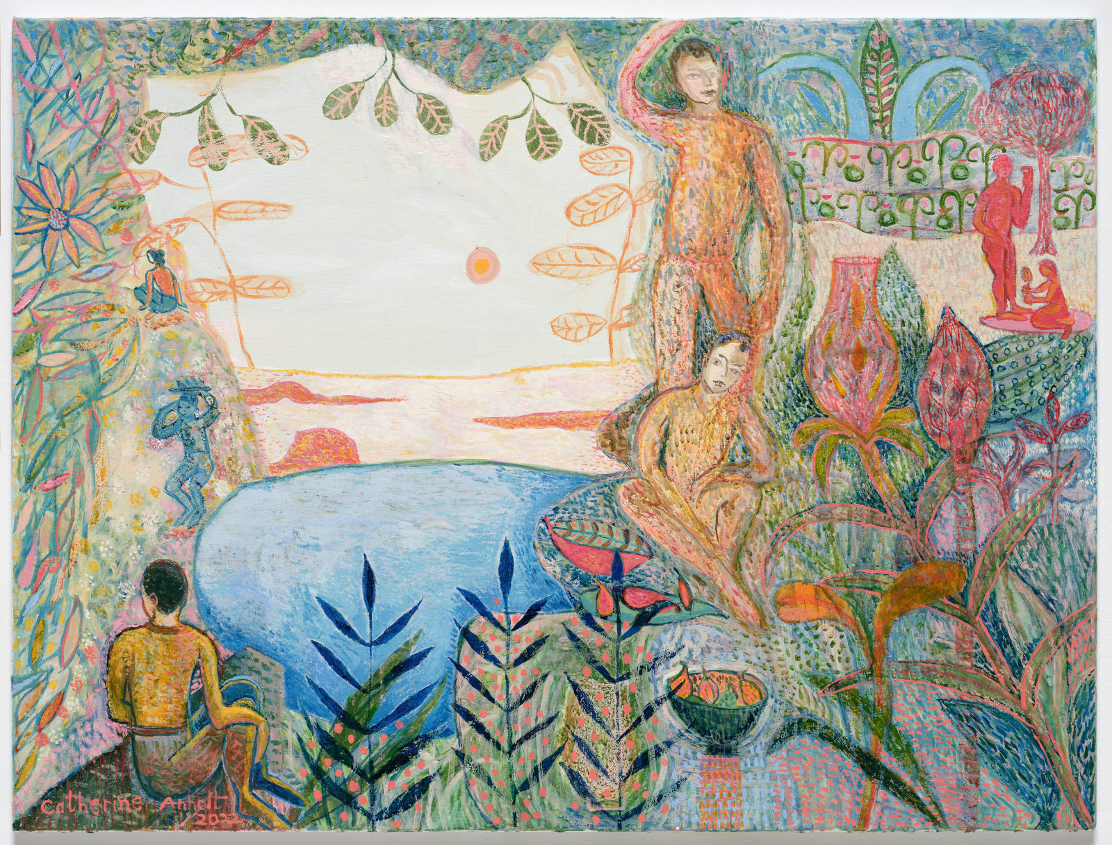 바다가 내려다보이는 영국 데본의 스튜디오에서 작업 중인 캐서린 안홀트(Catherine Anholt, b.1958, UK)는, 1985년 영국 왕립미술대학에서 석사 학위를 받기 전부터 이미 수많은 페인팅과 드로잉을 제작해왔다. 어린 시절부터 꾸준히 기록해 온 비주얼 다이어리와 병행해 작업하는 그녀는, 루소나 마티스를 연상시키는 몽환적인 이미지를 그려내며, 전통적이거나 종교적인 미술 양식을 떠올리게 하는 독특한 질감과 선을 통해 다양한 시각적 문화에 대한 오마주를 제시한다. 지난 30여 년간 남편 로렌스와 함께 200권이 넘는 동화책을 제작하며 삽화가로도 활동해온 그녀는, 창작과 스토리텔링에 대한 부부의 공동된 열정을 정글처럼 우거진 정원에 둘러싸인 집에서 꽃피워왔다. 안홀트의 회화는 모성애, 가족, 자연이라는 주제를 중심으로 자신의 삶과 예술적 여정을 반영하며, 나아가 우리 삶을 이루는 다양한 형태의 연대에 대한 은유적 고찰을 담아낸다.