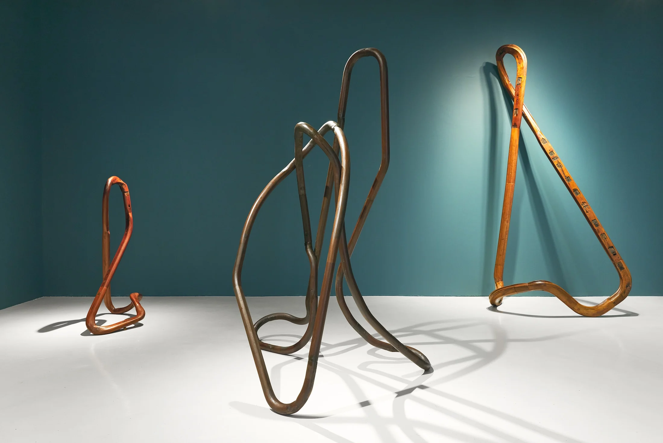 The ‘lemniscate’ series consists of various sculptures made from wooden bannisters reclaimed from old houses awaiting demolition, and then repurposed and fitted together so that they form an infinite loop. The handrail is an object moulded specifically to fit in the palm of the hand extruded to an architectural scale. Never moving but always guiding, it has the ability to connect through touch and lead from one place to another, choreographing the absent human body into three dimensional space. The old wooden bannisters were crafted over a hundred years ago by human hands, and spent the next century interacting with other hands, then were remade by hand again to form infinite loops. Through continuous exposure and contact with human skin these handrails preserve the memory of human bodies and with it the identities of the houses they came from; they become portraits of different places, many of which no longer exist. Drawing upon both the presence and absence of existence, infinitely tied together.