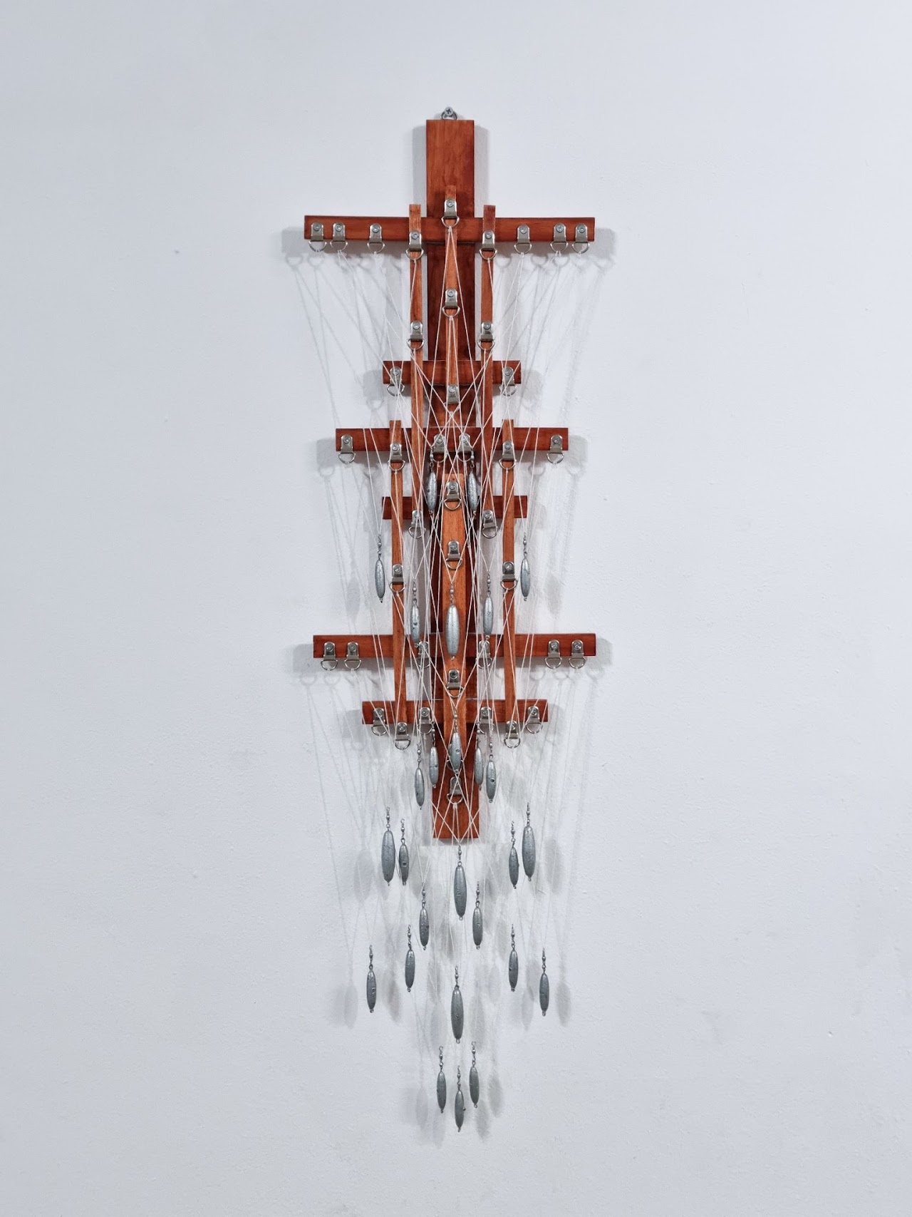 Minhoon Kim, Wingless Groundless Torso 01, 2025, Over rubber tree wood, over silver powder paint, over rings and threads with lead weights, 85 x 24 x 4cm. Courtesy of the Artist and drawingRoom.